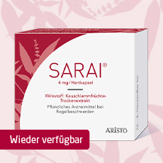 Aufgrund einer Produktionsumstellung konnte das pflanzliche Arzneimittel zeitweise nicht zur Verfügung gestellt werden. Sarai® wird in Deutschland produziert und steht Ihren Kundinnen und Patientinnen ab sofort wieder uneingeschränkt zur Verfügung.