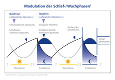 Bei leichten bis mittelschweren nervös bedingten Schlafstörungen bietet sich ALLUNA® von Repha an. Denn die Baldrian-/Hopfen-Fixkombination verkürzt nachweislich die Schlaflatenz und verbessert die Schlafqualität durch Reduktion des nächtlichen Erwachens und daraus resultierende längere Tiefschlafphasen5-8. Dabei ist das pflanzliche Arzneimittel gut verträglich und sorgt auf natürliche Art für ein erholtes Aufwachen am Folgetag5-10. Die Wirkrationale der pflanzlichen Einschlafhilfe beruht auf dem heute gültigen Adenosin-Melatonin-Schlafmodell11. Demzufolge steigert der im Tagesverlauf zunehmende endogene Adenosin-Spiegel die Müdigkeit zum Abend hin. Das Melatonin wiederum, das bei Dunkelheit vermehrt freigesetzt wird, induziert den Schlaf (>> Abb. 1). Einen ähnlichen Wirkmechanismus wie die endogenen Schlafmoleküle Adenosin und Melatonin weist der in ALLUNA® enthaltene methanolische Spezialextrakt Ze 91019 auf (>> Abb. 1). Ein entscheidender Faktor für die Wirksamkeit des Extrakts ist das Lösungsmittel. Nur in methanolisch gelösten Baldrianextrakten, wie in Ze 91019, sind die schlaffördernden Lignane in ausreichender Konzentration vorhanden12, um die Adenosin-Rezeptoren zu aktivieren und zu einer Erhöhung des Schlafdrucks zu führen13,14. Die Hopfenbestandteile binden hingegen an Melatonin-Rezeptoren im Zentralnervensystem und senken, wie das schlafinduzierende Melatonin, u. a. die Körpertemperatur, was wiederum eine schlaffördernde Wirkung hat15,16. Diese Ergebnisse gelten nur für den untersuchten Extrakt