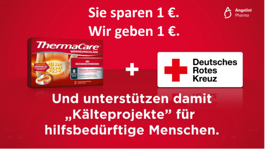 München - Über den gesamten November veranstaltet ThermaCare eine Coupon-Aktion, bei der Kund:innen je gekaufter Aktionspackung 1€ sparen, während Angelini Pharma verschiedene Kälteprojekte des Deutschen Roten Kreuzes (DRK) mit 1€ pro verkaufter Aktionsverpackung unterstützt. Die Coupon-Aktion gilt in teilnehmenden Apotheken für alle ThermaCare-Produkte in den Einstiegsgrößen: