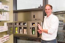 Der Kunde kann nun zu beliebiger Zeit, sogar nachts, die Abholnummer am Fach eingeben und erhält sein Medikament.