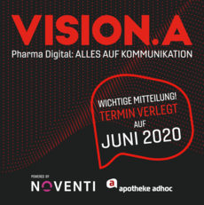 Berlin - Die Digitalkonferenz VISION.A – powered by NOVENTI und APOTHEKE ADHOC, die in diesem Jahr am 11. und 12. März 2020 in Berlin stattfinden sollte, wird verschoben und im Juni 2020 über die Bühne gehen. Das entschied am Wochenende das Management der EL PATO Medien GmbH. Grund für die Verschiebung der renommierten Konferenz, zu der mehr als 50 Speaker und 500 Gäste erwartet werden, ist die Ausbreitung des Coronavirus.
