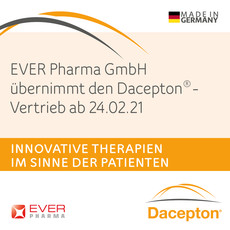 Groebenzell - Das Pharma- und Innovationsunternehmen EVER Pharma GmbH übernimmt zum 24.02.2021 den Vertrieb des eigenen Parkinson-Präparates Dacepton® von der Licher MT. EVER Pharma begründet diesen Schritt mit dem Ziel, die Therapiequalität weiter verbessern zu wollen. Als Hersteller von Präparat-, Injektions- und Pumpentechnologie eröffnet sich durch den direkten Zugang zu den behandelnden Ärzten eine einmalige Konstellation Forschung und Entwicklung im Sinne der Patienten voranzutreiben. Damit wird der Weg, der 2019 mit der Einführung der neuen speziell für die Apomorphin-Therapie entwickelten subkutanen Infusionspumpe (D-Mine Pumpe®) begonnen wurde, nun konsequent fortgesetzt. Um die höchstmögliche Qualität in der Arztkommunikation zu sichern, und die bestmögliche Therapie für jeden Morbus Parkinson Patienten bereitzustellen, baut Ever Pharma GmbH auf ein Team aus Spezialisten.