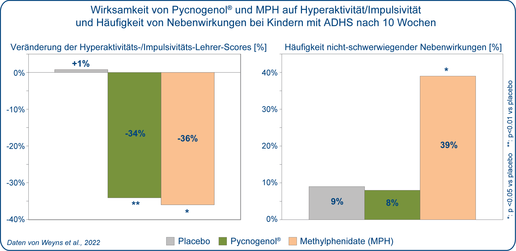Wirksamkeit von Pycnogenol und MPH auf Hyperaktivität / Impulsivität und Häufigkeit von Nebenwirkungen bei Kindern mit ADHS nach 10 Wochen (Weyns et al. 2022)