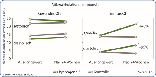 Eine Pilot-Studie1 mit 82 Tinnitus-Patienten konnte zeigen, dass die Supplementierung mit Pycnogenol® die Tinnitus-Symptome deutlich lindern konnte. Die Studie verglich jeweils die Aufnahme von 150 mg sowie 100 mg Pycnogenol® pro Tag und einer Kontrollgruppe. Dabei konnte in Hinblick auf die Tinnitus-Skala ein deutlicher Einfluss von Pycnogenol® verzeichnet werden. Weiterhin untersuchte die Studie die Wirkung einer Pycnogenol®-Supplementierung auf die Innenohr-Mikrozirkulation – dabei konnte die niedrige, cochleäre Durchblutungsgeschwindigkeit im Tinnitus-Ohr der Probanden normalisiert werden, sowohl systolisch als auch diastolisch (siehe Abb 1.).