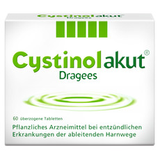 Cystinol akut® Dragees, Wirkstoff: Bärentraubenblätter-Trockenextrakt. Zusammensetzung: 1 überzogene Tablette enthält 238,7–297,5 mg Trockenextrakt aus Bärentraubenblättern (3,5–5,5 : 1) entsprechend 70 mg Hydrochinonderivate, berechnet als wasserfreies Arbutin (Photometrie Ph. Eur. 1998), Auszugsmittel: Ethanol 60 % (V/V). Sonstige Bestandteile: mikrokristalline Cellulose, langkettige Partialglyceride, Hypromellose, Lactose-Monohydrat, Macrogol 6000, Magnesiumstearat (Ph.Eur.), hochdisperses Siliciumdioxid, Chinolingelb E 104, Indigocarmin E 132, Titandioxid E 171. Anwendungsgebiete: entzündliche Erkrankungen der ableitenden Harnwege. Gegenanzeigen: bekannte Überempfindlichkeit gegen Bärentraubenblätter oder einen der sonstigen Bestandteile des Arzneimittels. Schwangerschaft und Stillzeit. Kinder unter 12 Jahren. Nebenwirkungen: selten bei magenempfindlichen Personen Magen-Darm-Beschwerden (Übelkeit und Erbrechen). Sehr selten allergische Reaktionen. Warnhinweis: enthält Lactose. Packungsbeilage beachten.