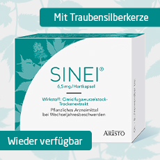 Ist eine Hormonersatztherapie nicht indiziert oder gewünscht, können laut aktueller S3-Leitline ebenfalls zugelassene Cimicifuga-Präparate (dt. Traubensilberkerze) wie SINEI® empfohlen werden1. SINEI® enthält 6,5 mg Trockenextrakt aus dem Cimicifuga-Wurzelstock und ist indiziert zur symptomatischen Therapie von psychischen und neurovegetativen Beschwerden bedingt durch die Wechseljahre.