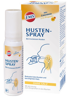 Zu den Antitussiva mit natürlicher Wirkweise gehört seit September 2018 auch das EMS Husten-Spray. Die Vorteile: Es kommt ohne Antibiotika, Antiseptika oder Konservierungsstoffe aus. Die osmotisch aktive hypertone Lösung wird auf die Rachenschleimhaut aufgesprüht und bildet dort einen Film. Dieser bewirkt durch das enthaltene Glycerol, dass mechanisch Flüssigkeit aus den tiefer gelegenen Rachenpartien gezogen wird. Bakterien, Viren und andere Reizstoffe wie Staub oder abgestorbene Zellteile werden aktiv ausgespült. Der Hustenreiz wird durch die Reinigung und Befeuchtung der Oberfläche vermindert. Gleichzeitig schützt der im Rachen gebildete Schutzfilm die gereizte Schleimhaut vor Austrocknung und anderen Reizungen. Calendula, Propolis und Leinöl erhöhen die Elastizität des Schutzfilms. Honig sorgt für einen angenehmen Geschmack. Der Glycerol-Anteil im neuen EMS Husten-Spray beträgt 40 %.