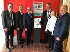 Erfolgreiche Inbetriebnahme in Neidlingen: Die Rezepte der Gemeinde im Kreis Esslingen kön-nen künftig schnell und sicher digital über das callmyApo Terminal der VSA an die beiden an-geschlossenen Apotheken übertragen werden. v.l.n.r.: Apotheker Dr. Hansjörg Egerer, CDU-Bundestagsabgeordneter Michael Hennrich, VSA-Geschäftsführer Herbert Wild, Neidlingens Bürgermeister Klaus Däschler, Apothekerin Tilla Frank-Neumeyer und LAV-Präsident Fritz Becker.