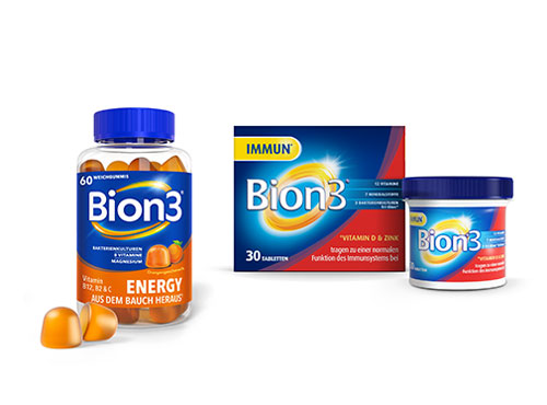 Bion3® Energy** Weichgummis kombinieren 8 essenzielle Vitamine, darunter B1, B2, Niacin, B6, Biotin und B12, die dabei helfen, die mentale und körperliche Energie** über den Tag hinweg aufrechtzuerhalten. Vitamin C und Magnesium tragen zur Verringerung von Müdigkeit** bei sowie ausgewählte B-Vitaminen zur Unterstützung des Darms***. Zusätzlich enthalten Bion3® Weichgummis 150 Millionen Bakterienkulturen (B. coagulans), die so ausgewählt wurden, den Darm lebend zu erreichen.