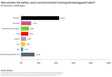 Große Koalition: 35,7 Prozent der Befragten sind für ein neues Bündnis von Union und SPD, unter den Inhabern noch etwas mehr (40,9 Prozent). Immerhin 25,2 Prozent würden stattdessen eine CDU-geführte Minderheitsregierung bevorzugen und 21,6 Prozent Neuwahlen. Einen zweiten Anlauf für Jamaika halten dagegen nur 8,5 Prozent für die beste Option.