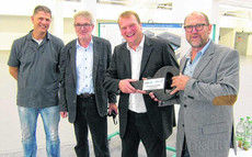 Schlüsselübergabe in der einstigen Fahr-Fabrik (v.l.): Bauleiter Dirk Drossel, Logistik-Planer Gerhard Schober, ACA-Generalbevollmächtigter Holger Gelhaar und Fabrik-Besitzer Hermann Repnik.