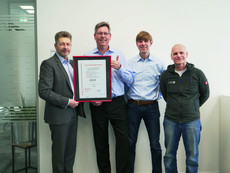Übergabe der Gesamtsieger-Urkunde. V. l.: Christoph Bach, Chefredakteur markt intern, ADG Geschäftsführer Joachim von Morstein, Dr. Max Schwesig und Bernd Hess