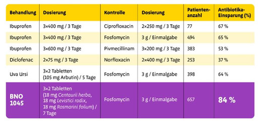 Diese Empfehlung stützt sich auf eine Metaanalyse, die den Behandlungserfolg von Strategien zur Einsparung des Antibiotikaeinsatzes bei Frauen mit unkomplizierten HWIs im Vergleich zu einer sofortigen Antibiotikabehandlung untersuchte.2 Eine der berücksichtigten Studien war die CanUTI-7-Studie, welche die Wirksamkeit einer pflanzlichen Dreierkombination aus Rosmarin, Tausendgüldenkraut und Liebstöckel (BNO 1045, enthalten in Canephron® Uno) im Vergleich zum Antibiotikum Fosfomycin belegte.3