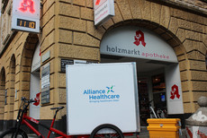 Der Pharmagroßhändler Alliance Healthcare beliefert die Apothekerin Suzanne Sennecke-Boelch, Holzmarkt-Apotheke, einmal am Tag mit dem Cargo Bike.