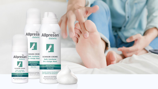 Hier kommen die Allpresan Schaum-Cremes ins Spiel. Denn Allpresan diabetic INTENSIV und die Allpresan diabetic INTENSIV + REPAIR sind nicht nur besonders auf die Bedürfnisse von Diabetiker*innen abgestimmt, sondern können auch in den Zehenzwischenräumen angewendet werden. Damit es nicht zu trockener Haut mit Symptomen wie Schuppung, Rissen, Erosionen, lokalen Verdickungen oder Ulzerationen kommt, müssen Patienten und Patientinnen mit Diabetes ihren Füßen besondere Aufmerksamkeit widmen. Das tägliche Eincremen mit lipidreichen Cremes ist essenziell, kommt aber immer mit dem Hinweis, die Produkte nicht in den Zehenzwischenräumen anzuwenden. Denn in den engen Zwischenräumen, in denen Haut an Haut liegt, bleiben häufig Reste der Cremes zurück. Zusammen mit dem feuchtwarmen Klima zwischen den Zehen steigt so die Gefahr, dass das Gewebe aufweicht und so zur Eintrittspforte infektiöser Keime wird. Als Folge können sich Infektionen bilden.