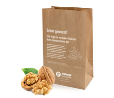 Zwischen Oktober und November 2018 werden insgesamt mehr als 2,5 Tonnen Walnüsse, gratis und in hübschen Papiertütchen portioniert, ihren Weg zum Endverbraucher finden. Walnüsse sind ideale Nährstofflieferanten, deren Stärken ganz besonders in der Schnupfenzeit zum Tragen kommen. Walnüsse besitzen einen sehr hohen Gehalt an einfach und mehrfach ungesättigten Fettsäuren sowie den Vitaminen E und B. Desweiteren beinhalten sie eine Reihe von wichtigen Mineralstoffen, darunter Kalium, Magnesium, Calzium und Eisen. Insbesondere das essentielle Spurenelement Zink macht Walnüsse wertvoll. Zink wird in nahezu allen Bestandteilen des menschlichen Abwehrsystems benötigt, z.B. für die Bildung von Immunzellen und Antikörpern. Zudem unterstützt Zink die Hautgesundheit und hilft unseren Schleimhäuten, Barrieren gegen Krankheitserreger zu bilden.