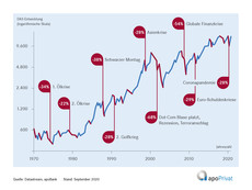 Derartige Entwicklungen sind kein Einzelfall. Ein Blick in die Vergangenheit zeigt, dass nach jeder Krise die Kurse im Anschluss nur umso stärker gestiegen sind. So hat der Deutsche Aktienindex DAX seit 1970 insgesamt 13 größere externe Schocks durchlebt, die in ihren Auswirkungen auf die Kurse teils noch deutlich gravierender waren als die Corona-Krise. Trotzdem ist der DAX in den vergangenen 50 Jahren um insgesamt über 2.000 Prozent gestiegen.