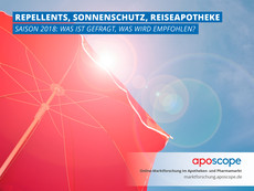 Die neue Studie "Repellents, Sonnenschutz, Reiseapotheke – Saison 2018: Was ist gefragt, was wird empfohlen?" liefert auf über 170 Seiten umfangreiche Ergebnisse zu mehr als 30 Fragen, die am 29. März 2018 von 309 Apothekern, Apothekerinnen und PTA beantwortet wurden. Die Marktforscher von APOSCOPE geben zu Reiseapotheke, Sonnen- und Insektenschutz exklusive Insights in die Themen Sortiment und Bevorratung, Empfehlungsverhalten, Benotung nach Design, Produktqualität, Preis-/Leistungsverhältnis, Marge und nach Gesamtnote.