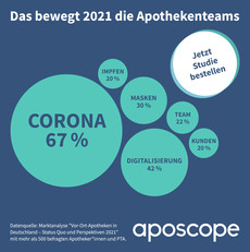 Berlin - Nach einem herausfordernden Jahr 2020 hält die Corona-Pandemie den Apotheken- und Pharmamarkt auch 2021 weiter in Atem. Um den Draht zu den Vor-Ort-Apotheken nicht zu verlieren und sie bestmöglich zu unterstützen, sind direkte Einblicke in die Situation und die Gefühlslage der Apothekenteams gefragt. Genau diese liefert die Studie „Vor-Ort-Apotheken in Deutschland – Status Quo und Perspektiven 2021“ von aposcope und dient damit als richtungsweisende Orientierung für die kommenden Monate. Denn für zwei Drittel der Befragten steht fest: Corona gehört auch 2021 weiter zu den wichtigsten Themen für das Apothekenpersonal.