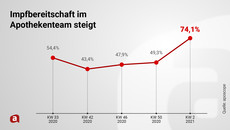 Laut aposcope-Befragung wollen sich drei von vier Personen, die in Apotheken arbeiten, gegen das Coronavirus impfen lassen. Unter Apothekerinnen und Apothekern sind es 83 Prozent, bei den Pharmazeutisch-Technisch Angestellten (PTA) 65 Prozent. Verglichen mit früheren aposcope-Befragungen steigt die Impfbereitschaft deutlich an: Noch Anfang Dezember waren es 70 Prozent der Apothekerinnen und Apotheker sowie 46 Prozent der PTA. Eine Impfpflicht fürs Apothekenteam befürworten dagegen nur 35 Prozent der Befragten.
