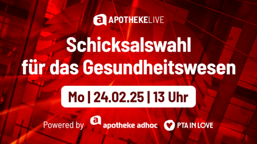 Berlin - APOTHEKE ADHOC LIVE analysiert am 24. Februar 2025 ab 13.00 Uhr exklusiv mit Top-Gästen aus Apotheker- und Ärzteschaft, Industrie und Krankenkassen die gesundheitspolitischen Folgen der Bundestagswahl. Der Online-Talk wird moderiert von Nadine Tröbitscher, Chefredakteurin von APOTHEKE ADHOC, und Herausgeber & ELPATO-CEO Tom Bellartz. Interessierte können sich auf webinar.apotheke-adhoc.de kostenfrei anmelden.
