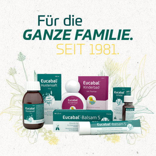 Eucabal®-Balsam S Creme. Wirkstoffe: Eukalyptusöl, Kiefernnadelöl. Zur Besserung der Beschwerden bei Erkältungskrankheiten der Atemwege mit zähflüssigem Schleim. Enthält Cetylstearylalkohol. Packungsbeilage beachten. Eucabal® Inhalat, 0,44 g/1 ml/1 ml Eucalyptusöl, 0,44 g/1 ml Kiefernnadelöl, Flüssigkeit zur Herstellung eines Dampfes zur Inhalation. Wirkstoffe: Eucalyptusöl/Kiefernnadelöl. Zur Inhalation zur Besserung der Beschwerden bei Erkältungskrankheiten der Atemwege mit zähflüssigem Schleim. Enthält Eucalyptusöl. Packungsbeilage beachten. Zur Inhalation. Nicht zum Einnehmen! Packungsbeilage beachten. Eucabal®-Hustensaft. Wirkstoffe: Thymianfluidextrakt, Spitzwegerichblätterfluidextrakt. Traditionelles pflanzliches Arzneimittel zur Besserung der Beschwerden bei Erkältungskrankheiten der Atemwege. Das Arzneimittel ist ein traditionelles Arzneimittel, das ausschließlich auf Grund langjähriger Anwendung für das Anwendungsgebiet registriert ist. Enthält 8,1 Vol.-% Alkohol, Methyl-4-hydroxybenzoat, Propyl-4-hydroxybenzoat, Invertzucker und Saccharose. Packungsbeilage beachten. Zu Risiken und Nebenwirkungen lesen Sie die Packungsbeilage und fragen Sie Ihre Ärztin, Ihren Arzt oder in Ihrer Apotheke. (Stand Juni 2024).