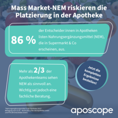 Berlin - Auf fachliche Beratung kommt es an: Mehr als zwei Drittel der Apothekenteams sehen Nahrungsergänzungsmittel (NEM) als sinnvoll an. Wichtig sei jedoch eine fachliche Beratung. Weil diese im Mass Market zu kurz komme, sei der Kauf dort womöglich gefährlich. Hersteller, deren apothekenexklusive Produkte plötzlich auch im Supermarkt & Co. auftauchen, riskieren zudem die Platzierung in der Apotheke. Dies zeigt eine aktuelle Studie von aposcope auf Basis der Befragung von 505 Apotheker:innen und PTA.