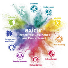 Das optische Wiedererkennungsmerkmal der OTC-Sparte von axicorp Pharma ist die unverwechselbare Farbexplosion. Diese begleitet die axicur®-Marke seit ihrer Einführung im Jahr 2019. Ziel ist, Apotheker und Endverbraucher mit einem klaren und modernen Auftritt sowie auffälligen Werbemaßnahmen zu begeistern. Dabei steht jede Farbe für ein eigenes Indikationsfeld. Icons weisen darauf hin, bei welchen Beschwerden die Medikamente eingesetzt werden können. Alle Farben der Packungen und die dazugehörigen Icons sind wiederum in der Farbexplosion zu finden und ergeben so einen harmonischen Markenauftritt.