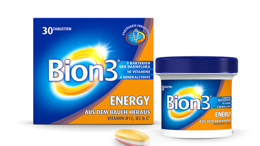 Multivitamine und Nahrungsergänzungsmittel wie Bion3 Energy2 und Bion3 50+ Energy2 wurden wissenschaftlich entwickelt, um mit Vitaminen den Darm3 zu unterstützen und dabei zu helfen, die körperliche und mentale Energie freizusetzen. Durch den einzigartigen 3-in-1-Komplex kombiniert jede Tablette drei Bakterien der Darmflora, mit zehn Vitaminen (12 Vitamine bei Bion3 50+ Energy2), darunter Vitamin C, D und das Vitamin-B-Komplex sowie vier Mineralstoffen (7 Mineralstoffe bei Bion3 50+ Energy2), darunter Zink, Eisen und Magnesium. Die Tabletten haben zusätzlich eine spezielle Beschichtung, die die Bakterien der Darmflora schützt, damit sie den Darm lebend erreichen.