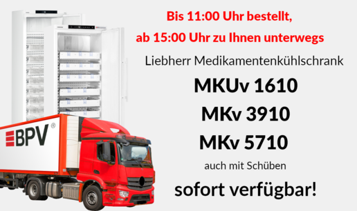 Als Reaktion auf den erhöhten Bedarf nach schneller Lieferung von Medikamentenkühlschränken nach DIN 58345 bieten wir aktuell eine besonders schnelle Lieferung für Geräte der Typen Liebherr Medikamentenkühlschrank MKUv 1610, MKv 3910 oder MKv 5710 an. Diese Geräte sind bei BPV in der Standardausstattung mit fünf Rosten, aber auch mit den hochwertigen BPV Metall-Systemschüben oder mit Liebherr Schüben, sofort verfügbar.