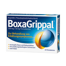 BoxaGrippal® 200 mg / 30 mg Filmtabletten. Wirkstoffe: 200 mg Ibuprofen und 30 mg Pseudoephedrinhydrochlorid/Filmtablette. Sonstige Bestandteile: Lactose-Monohydrat, Mikrokristalline Cellulose, Carboxymethylstärke-Natrium (Typ A), Hochdisperses Siliciumdioxid, Magnesiumstearat, Polyvinylalkohol, Titandioxid (E 171), Macrogol 3350, Talkum. Anwendungsgebiet: Zur symptomatischen Behandlung der Schleimhautschwellung von Nase und Nebenhöhlen verbunden mit Kopfschmerzen, Fieber und erkältungsbedingten Schmerzen bei Jugendlichen ab 15 Jahren und Erwachsenen. Gegenanzeigen: Überempfindlichkeit gegen Ibuprofen, Pseudoephedrinhydrochlorid oder einen der sonstigen Bestandteile; Patienten unter 15 Jahren; Schwangerschaft und Stillzeit; Allergien oder Asthma in der Anamnese, ausgelöst durch NSAIDs; gastrointestinale Blutungen oder Perforationen in der Anamnese durch NSAIDs; bestehende oder wiederholt aufgetretene peptische Ulzera oder Hämorrhagien; zerebrovaskuläre oder andere Blutungen; ungeklärte Störungen der Hämatopoese; schwere Leberinsuffizienz; schwere Niereninsuffizienz; schwere Herzinsuffizienz; schwere oder nur unzureichend kontrollierte Hypertonie; Schlaganfall oder Risikofaktoren für einen Schlaganfall in der Anamnese; schwere Koronarinsuffizienz; Risiko eines Engwinkelglaukoms; Risiko der Harnretention aufgrund von urethroprostatischen Beschwerden; Myokardinfarkt in der Anamnese; zerebrale Krampfanfälle in der Anamnese; Systemischer Lupus erythematodes; Kombination mit anderen oral oder nasal angewendeten vasokonstriktorisch wirksamen Arzneimitteln; Kombination mit Methylphenidat; Kombination mit nichtselektiven MAO-Inhibitoren oder Anwendung von MAO-Inhibitoren innerhalb der letzten zwei Wochen. Nur nach Rücksprache mit dem Arzt anwenden bei Diabetes mellitus, Magen-Darm-Erkrankungen, Hyperthyreose und Asthma. Nebenwirkungen: Verdauungsstörungen, Bauchschmerzen, Übelkeit, Erbrechen, Blähungen, Durchfall, Verstopfung, Kopfschmerzen, Schwindel, Schlafstörungen, Unruhe, Reizbarkeit, Müdigkeit, Sehstörungen, Geschwüre im Magen-Darm-Bereich, manchmal mit Blutungen und Durchbruch, Verschlimmerung von chronisch-entzündlichen Darmerkrankungen (z.B. Colitis und Morbus Crohn), Hautausschläge, Tinnitus, Nierengewebsschädigungen, Störung der Blutbildung (kann sich in erhöhter Neigung zu Blutergüssen oder Anfälligkeit für Infektionen äußern), schwere allergische Reaktionen, psychotische Reaktionen, Depression, Bluthochdruck, Herzklopfen, Herzinfarkt, Leberschädigungen, schwere Hautreaktionen, Nierenfunktionsstörung, Schwierigkeiten beim Wasserlassen. Die Einnahme ist sofort abzubrechen und ein Arzt aufzusuchen, wenn Anzeichen von Magen-Darm-Blutungen oder Anzeichen einer schweren allergischen Reaktion auftreten. Warnhinweis: Enthält Lactose. Boehringer Ingelheim Pharma GmbH & Co. KG, Ingelheim am Rhein. 0714