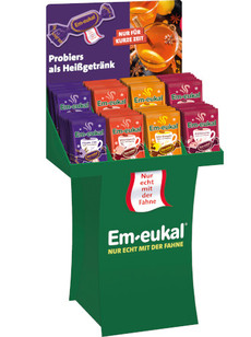 Präsentiert in einem aufmerksamkeitsstarken Display sorgt die Em-eukal Winteredition für Absatzgenuss. Die Innovation Em-eukal Glühkirsche schmeckt mit einem Anteil von sechs Prozent Kirschsaft wie eine frisch gepflückte Frucht vom Baum. Eine Prise Zimt macht den Glühgenuss perfekt. Apropos Zimt: Seit Jahren beliebt ist die Sorte Pflaume-Zimt. Diese wartet mit einem Anteil von acht Prozent Pflaumensaft auf und ist ebenso mit Zimt verfeinert. Auf der Beliebtheitsskala ganz oben rangiert auch die Variante Süßer Bratapfel. Hier überzeugt eine Kombination aus fruchtiger Süße mit winterlichen Gewürzen und einem Hauch von Zimt. Fruchtig-lecker ist ebenso die Rezeptur von Em-eukal Winterpunsch: eine Melange aus Heidelbeer-, Kirsch- und Orangensaftkonzentrat und fein aufeinander abgestimmten Gewürzen. Die Zubereitung des winterlichen Trinkgenusses verrät die Beutelrückseite: Ein bis zwei Bonbons in eine Tasse geben, mit 200 ml kochendem Wasser übergießen, acht bis zehn Minuten warten, gelegentlich umrühren und nach Belieben mit einem Schuss Saft sowie einer Zimtstange verfeinern. em-eukal.de