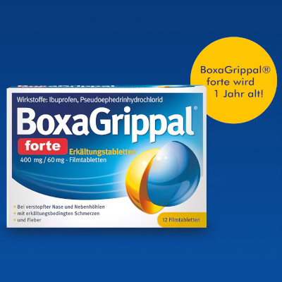 München - Seit einem Jahr unterstützt BoxaGrippal® forte Betroffene im Kampf gegen stärkere Erkältungssymptome. Mit der doppelten Dosierung der Wirkstoffkombination aus Ibuprofen (400 mg) und Pseudoephedrinhydrochlorid (60 mg, Abk.: PSE) bleiben Betroffene im Alltag leistungs- und handlungsfähig. Die vielfältigen Beschwerden wie Kopf-, Hals- und Gliederschmerzen, Fieber sowie geschwollene Nasen- und Nasennebenhöhlenschleimhäute werden gelindert und gleichzeitig wird die Entzündung bekämpft – ohne Rebound-Effekt und ohne müde zu machen.