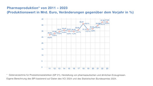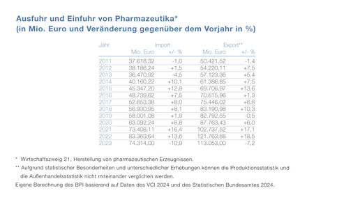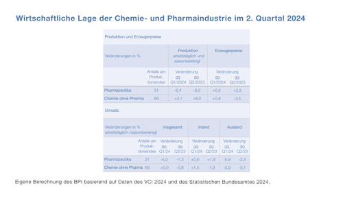Berlin - Die neuen „Pharma-Daten 2024“ des Bundesverbands der Pharmazeutischen Industrie e.V. (BPI) zeigen: Die Wirtschaftslage in Deutschland bleibt angespannt und auch die pharmazeutische Industrie sieht sich mit Rückgängen in Produktion und Außenhandel konfrontiert. Die Produktion konnte im Vorjahr nur minimal um 0,5 Prozent zulegen und ging in den ersten beiden Quartalen 2024 sogar um 6,4 Prozent zurück. Auch der Außenhandel zeichnet ein rückläufiges Bild: Die Exporte pharmazeutischer Erzeugnisse sanken um 7,2 Prozent, die Importe um 10,9 Prozent. Diese Entwicklungen spiegeln nicht nur die gedämpfte Dynamik der (Welt-)Wirtschaft wider, sondern auch die strukturellen Belastungen innerhalb der Branche.