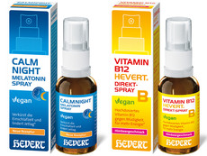 Die beiden Sprays CalmNight Melatonin Spray sowie Vitamin B12 Hevert Direkt-Spray ergänzen das Hevert-Sortiment hervorragend. Während das Melatonin-Spray für erholsame Nächte sorgt, wird mit Hilfe des Vitamin B12-Sprays der tägliche Sprühstoß Energie gewährleistet. Beide Nahrungsergänzungsmittel sind ausschließlich in der Apotheke erhältlich.
