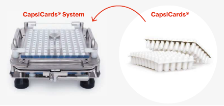 CapsiCards® enthalten 50 oder 60 leere Hartgelatinekapseln in den Größen 00 bis 4 sowie in den Farben weiß, transparent und creme. Die CapsiCards® Maschine ist in zwei Varianten mit 100 oder 120 Fülllöchern erhältlich und kann jeweils zwei CapsiCards® Karten gleichzeitig aufnehmen.
