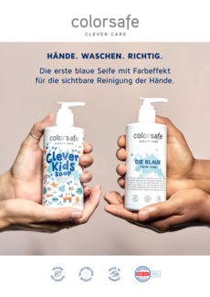 Die vegane Naturseife ist pH-Hautneutral und dermatologisch mit sehr gut getestet. Sie kommt ohne SLS/SLES, Gentechnik, Mikroplastik, Parabene und Silikone aus und wird in Deutschland produziert. Die Seife mit Farbeffekt kann in den Varianten „DIE BLAUE clever soap“ und „DIE BLAUE clever kids soap“ über die Internetseite www.color-safe.de, über die Shop Apotheke bestellt werden und ist in vielen Apotheken direkt erhältlich. (PZN Nr.17531428 /17531411)