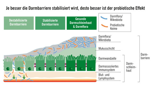 „Der Einsatz von Probiotika kann grundsätzlich dazu beitragen, die erste Schutzschicht der Darmbarriere – die Mikrobiota – positiv zu beeinflussen“, so Storr. Ihre Effizienz hängt dabei in vitro-Untersuchungen zufolge unter anderem von der Vitalität des Darmepithels und der Dichtigkeit der Darmbarriere ab.[2] Eine intakte Darmbarriere ist essenziell sowohl für eine erfolgreiche Anhaftung der Probiotika als auch eine gesunde Mikrobiota. Um den Effekt der Probiotika zu optimieren, ist es daher sinnvoll, vor und während der Probiotikatherapie die Darmbarriere zu stabilisieren. „Den Bakterien wird so ein solides Fundament angeboten, auf dem sie ihre positiven Effekte ausüben können“, erklärt Storr.
