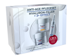 Das Pflegeset Hyaluron-Filler + Elasticity bietet ein hochwertiges, perfekt abgestimmtes Pflegesystem zur Milderung fortgeschrittener Anzeichen der Hautalterung. Das Trio wirkt selbst tiefen Falten und Pigmentflecken sowie Elastizitätsverlust entgegen und beinhaltet die 20 ml Tagespflege mit LSF 30, eine 20 ml Nachtpflege sowie ein 5 ml Hyaluron-Filler + 3x Effect Serum-Konzentrat.