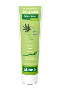 In der neuen BIO-HANF-Zahncreme schützt der siebenfache Wirkkomplex aus Hanf, Kurkuma, Kokosöl, Xylitol, Hamamelis, Aloe vera und pflanzlichen Carnauba-Wachsperlen Zähne und Zahnfleisch. Die Kombination aus Kurkuma, Kokosöl und Xylitol beugt Zahnfleischentzündungen vor und bekämpft kariesverursachende Bakterien. Der Hanf, die Zaubernuss Hamamelis und Aloe vera pflegen das Zahnfleisch nachhaltig. Außerdem werden wichtige Omega-3- und -6-Fettsäuren aus dem Hanf über die Mundschleimhaut aufgenommen.