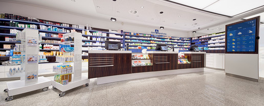 Betont wird die Offizin nicht nur von einer brillanten Beleuchtung, die den Granitboden und die Einrichtung ins rechte Licht rückt. Eine gelungene Lösung ist die Akustik- und Lichtdecke, ausgestattet mit einer schallabsorbierenden Membran, die eine diskrete Beratung ermöglicht. Übersichtlich angeordnet sind die HV-Tische mit modernster Technik, wie Kundendisplay, ec-Terminal, eRezept-Scanner sowie zwei Medikamentenausgaben aus dem Automaten im Keller. Für Kurzweil sorgt ein großer Monitor in der Raummitte, der historische Fotos sowie aktuelle Motive passieren lässt.