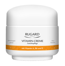 Die Vitamin-Creme von RUGARD wirkt wie ein Vitamin-Booster für die Haut. Vitamin A fördert den Regenerationsprozess der Haut, beugt Unreinheiten vor und steigert die Zellregeneration und Hautelastizität. Vitamin B6 pflegt besonders anspruchsvolle Haut und sorgt für eine gesunde Zellteilung. Vitamin E umgibt die Haut wie eine Schutzhülle, fängt freie Radikale ab und unterstützt die Feuchtigkeitsspeicherung der Haut. Damit ist die RUGARD Vitamin-Creme bestens geeignet für die Pflege nach dem Sonnenbad oder in Kombination mit einer Sonnencreme.