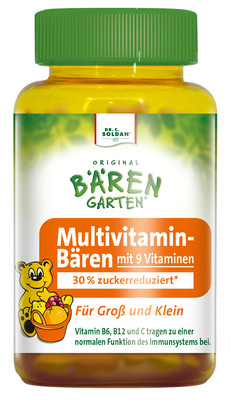Adelsdorf - Ab sofort gibt es das erste zuckerreduzierte und apothekenexklusive Nahrungsergänzungsmittel. Dr. C. SOLDAN hat sein Original BÄRENGARTEN-Sortiment um eine Innovation erweitert. Erstmalig in ihrer 115-jährigen Geschichte präsentieren die Bonbonspezialisten ein Nahrungsergänzungsmittel mit neun hochdosierten Vitaminen: die Original BÄRENGARTEN Multivitamin-Bären. Das neue Premiumprodukt für Groß und Klein stärkt das Immunsystem und ist - im Vergleich zu anderen vitaminisierten Fruchtgummis und Gummidrops - um 30 Prozent zuckerreduziert. Hergestellt mit all dem Wissen und Können des Familienunternehmens überzeugen die Bären mit herrlich intensiv-fruchtigem Geschmack, in den Sorten Zitrone, Mandarine und Himbeere.