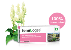 femiloges®, Wirkstoff: Rhapontikrhabarberwurzel-Trockenextrakt: 1 magensaftresistente Tablette enthält den Wirkstoff: 4 mg Trockenextrakt aus Rhapontikrhabarberwurzel (16-26:1); Auszugsmittel: wässrige Calciumoxid-Lösung (Calciumoxid : Gereinigtes Wasser im Verhältnis 1:38 (m/m)). Die sonstigen Bestandteile sind: Calciumcarbonat (E 170), Carnaubawachs, Cellacefat, gebleichtes Wachs, Lactose-Monohydrat (Milchzucker), Macrogol 6000, Macrogol 35000, Magnesiumstearat [pflanzlich], Methacrylsäure-Methylmethacrylat-Copolymer (1:1), mikrokristalline Cellulose, Natriumdodecylsulfat, Povidon K 25, Povidon K 90, Sucrose (Zucker), Talkum, Titandioxid (E 171), Triacetin. Anwendungsgebiete: femiloges® wird angewendet zur Besserung der durch die Wechseljahre bedingten psychischen und neurovegetativen Beschwerden wie Hitzewallungen/Schweißausbrüche, Schlafstörungen, depressive Verstimmungen und Ängstlichkeit. Gegenanzeigen: Überempfindlichkeit gegen den Wirkstoff oder einen der sonstigen Bestandteile, Schwangerschaft oder Stillzeit, ungeklärte genitale Blutungen, Bestehen oder Verdacht auf einen östrogenabhängigen Tumor, da nicht bekannt ist, ob Rhapontikrhabarberwurzel-Trockenextrakt das Wachstum eines östrogenabhängigen Tumors beeinflusst. Nebenwirkungen: Sehr selten kann es zu Überempfindlichkeitsreaktionen der Haut (Hautrötung, Hautschwellung, Juckreiz) kommen. Warnhinweise: Enthält Lactose (Milchzucker) und Sucrose (Zucker). Bitte Packungsbeilage beachten.
