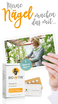In der täglichen Nahrung ist Vitamin H in unterschiedlichen Konzentrationen vorhanden. Die Verfügbarkeit für den Körper schwankt dabei aber, da proteingebundenes Vitamin H erst im Darm gespaltet werden muss. Durch BIO-H-TIN® Vitamin H können die Nägel dauerhaft für den Alltag gestärkt werden. Dazu sollten BIO-H-TIN® Vitamin H 2,5 mg Tabletten täglich über mindestens 6-8 Monate eingenommen werden. So lange dauert es, bis der nachwachsende Nagel sichtbar kräftiger, glatter und glänzender wirkt.