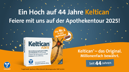 Anlässlich dieses besonderen Jubiläums feiern wir dieses Ereignis mit einem eigenen Keltican® forte Stand auf der APOTHEKENTOUR. Besucherinnen und Besucher haben die Gelegenheit, alles rund um das Thema Nervenregeneration zu erfahren und mit uns auf 44 Jahre Keltican® anzustoßen. Bei unserem Aktionsspiel sind zudem eine ruhige Hand