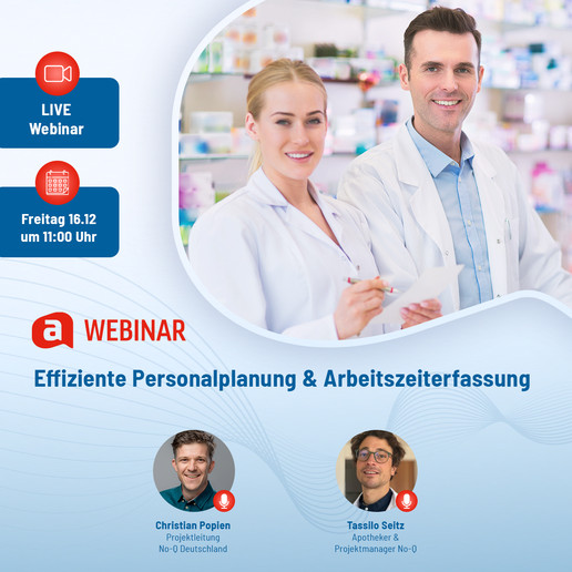 Berlin - Am Freitag, den 16. Dezember 2022 findet um 11:00 Uhr eine Fortbildung zum Thema Personalplanung & Arbeitszeiterfassung in Apotheken statt. Dabei werden die neuesten Funktionen wie Planarbeitszeiten und die einfache Dokumentation von Urlaubs- und Krankheitstagen in No-Q als Software zur Mitarbeiterverwaltung vorgestellt.