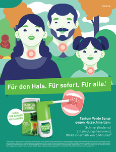 Wir alle wissen, wie belastend es sein kann, wenn Halsschmerzen auftreten – hier können Apotheker:innen eine schnelle und hygienische Lösung für die ganze Familie bieten: das Tantum Verde Spray. Der enthaltene Wirkstoff Benzydaminhydrochlorid wirkt entzündungshemmend, leicht betäubendi und wirkt bereits nach fünf Minutenii für bis zu drei Stunden.iii So kann man schnell wieder den Spätsommer genießen.