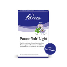 Zusätzlich können Sie Ihre Reiseapotheke durch das pflanzliche Arzneimittel Pascoflair® Night ergänzen. Die darin enthaltenen Inhaltsstoffe Passionsblume, Baldrian und Melisse haben sich seit Jahrhunderten als Heilpflanzen bewährt. In Pascoflair® Night bilden sie eine harmonische Mischung - entspannend für das Nervenkostüm und schlaffördernd.