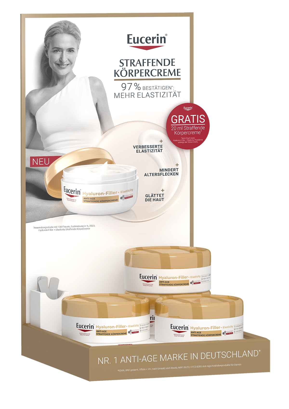 Zum Marktstart der Hyaluron-Filler + Elasticity Straffenden Körpercreme im März führt Eucerin eine Promotion in stationären Apotheken durch. Deko-Material und Aufsteller sorgen für Aufmerksamkeit bei den Kund*innen. Beim Kauf einer Eucerin Anti-Age Hyaluron-Filler + Elasticity Straffenden Körpercreme oder eines Gesichtspflege-Produkts erhalten Kund*innen in teilnehmenden Apotheken und solange der Vorrat reicht eine Gratis 20ml Hyaluron-Filler + Elasticity Körpercreme dazu. Die Promotion wird durch einen TV-Spot für die Anti-Age Hyaluron-Filler + Elasticity Gesichtspflege begleitet und findet im Zeitraum April/Mai statt.